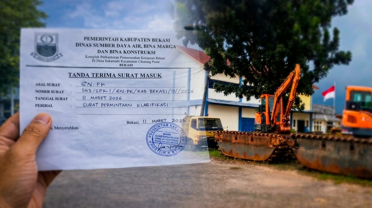 Berdasarkan dokumen tanda terima surat masuk, surat permintaan klarifikasi tersebut telah diterima oleh Dinas SDA Bina Marga dan Bina Konstruksi Kabupaten Bekasi pada 11 Maret 2026.