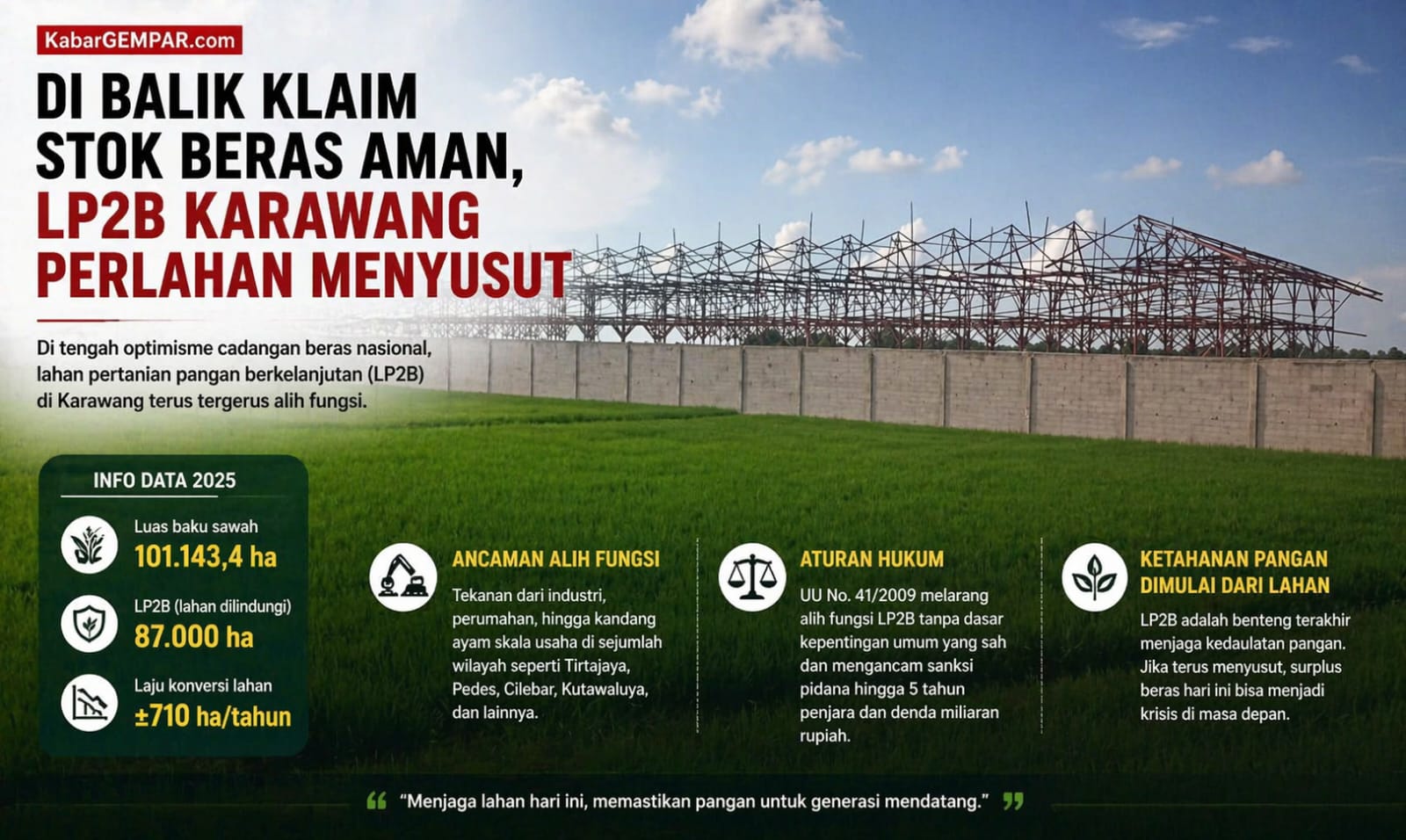 KARAWANG | KabarGEMPAR.com – Optimisme pemerintah terkait melimpahnya cadangan beras nasional tidak serta-merta menutup persoalan mendasar di sektor pertanian, khususnya di Kabupaten Karawang. Di balik klaim stok aman hingga 11 bulan ke depan, ada realitas lain yang berjalan diam-diam: penyusutan lahan pertanian pangan berkelanjutan (LP2B).