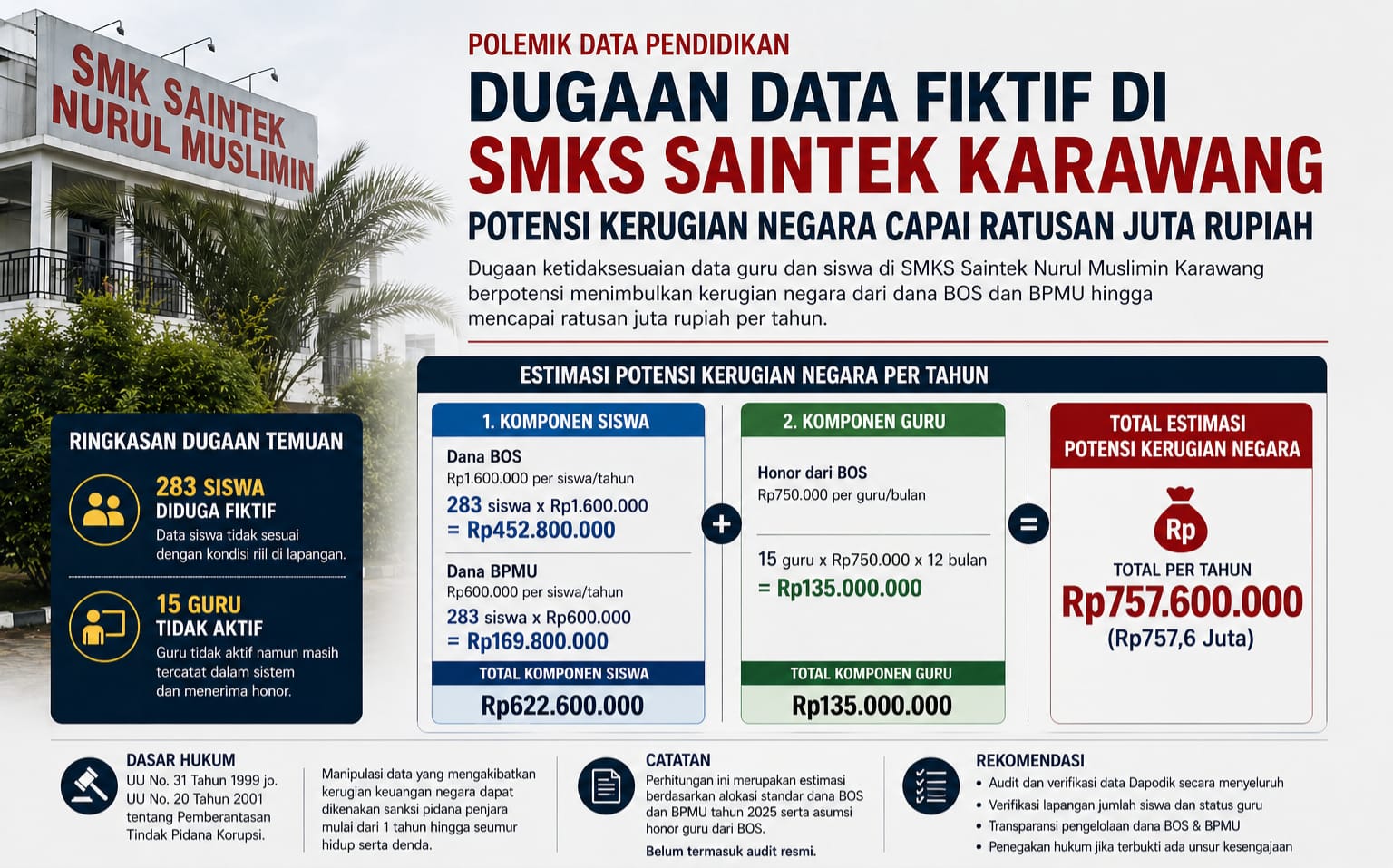 Untuk jenjang SMK, dana Bantuan Operasional Sekolah (BOS) rata-rata sekitar Rp1,6 juta per siswa per tahun. Dengan dugaan 283 siswa tidak valid, maka potensi dana yang tidak tepat sasaran mencapai sekitar Rp452,8 juta per tahun.