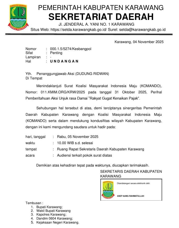 Undangan bernomor 000.1.5/5274/Kesbangpol itu ditandatangani secara elektronik oleh Sekretaris Daerah Kabupaten Karawang, Asep Aang Rahmatullah, dan ditujukan langsung kepada penanggung jawab aksi, Dudung Ridwan, yang juga dikenal sebagai Ketua Umum KOMANDO.