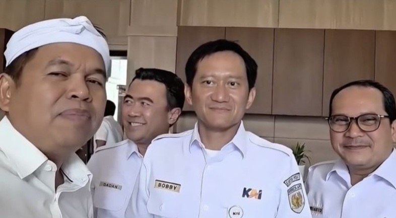 Gubernur Jawa Barat, Dedi Mulyadi, usai bertemu Direktur Utama KAI, Bobby Rasyidin.
