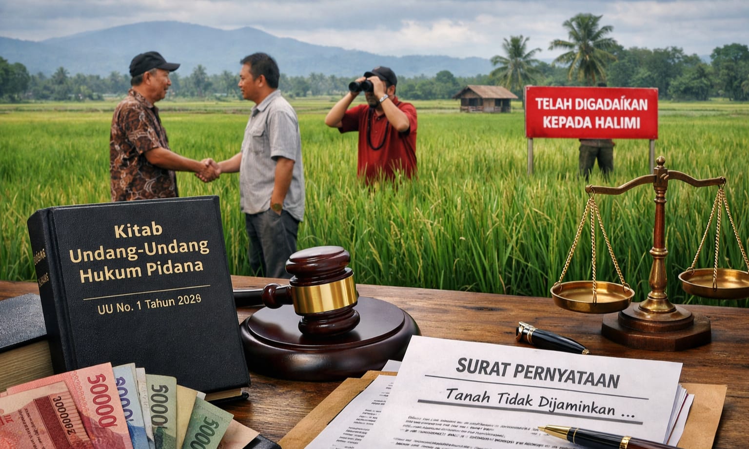 Praktik penjaminan tanah sawah yang dilakukan lebih dari satu kali terhadap objek yang sama bukan sekadar persoalan utang-piutang. Dalam perspektif hukum pidana modern, tindakan tersebut dapat melampaui batas wanprestasi dan masuk ke wilayah tindak pidana, terlebih setelah berlakunya Undang-Undang Nomor 1 Tahun 2023 tentang Kitab Undang-Undang Hukum Pidana.