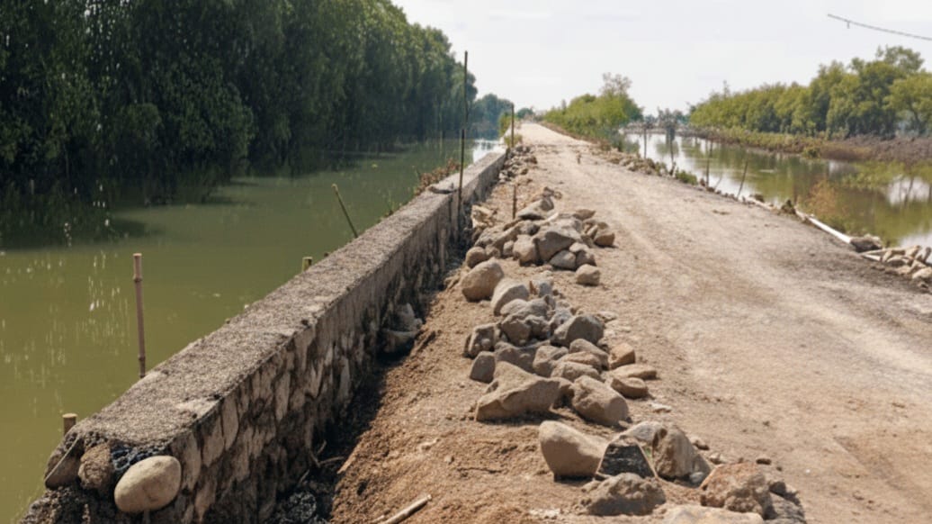 Pantauan KabarGEMPAR.com, Senin (24/11/2025), menunjukkan pekerjaan turap dilakukan saat area masih tergenang air tanpa proses pengeringan terlebih dahulu. Batu kali yang menjadi bagian pondasi juga terlihat hanya disusun seadanya, tanpa tahapan dasar teknis yang semestinya dilakukan dalam pekerjaan konstruksi.