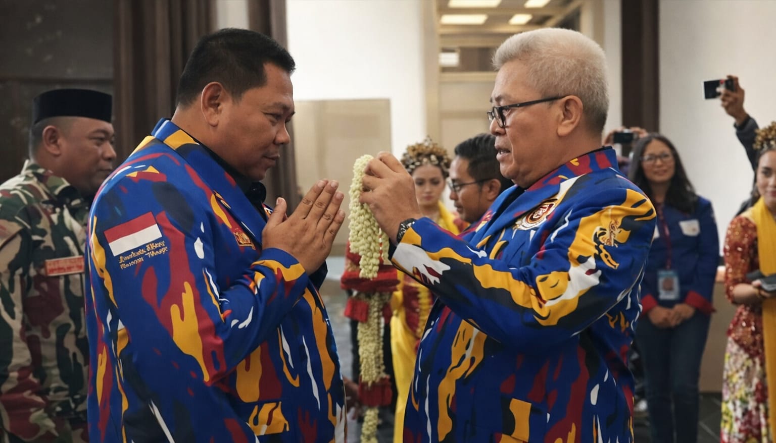 Ketua Umum NKRI H. M.E. Suparno (kanan) menyematkan kalung bunga kepada salah satu pengurus dalam pembukaan Rapat Kerja Nasional (Rakernas) NKRI di Hotel Swiss-Belinn Karawang, Minggu (1/2/2026).