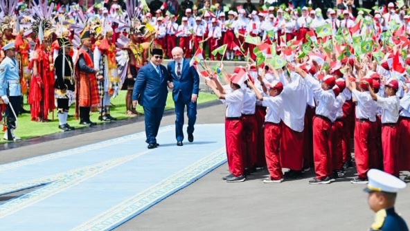 Setelah prosesi di kawasan Monas, upacara penyambutan resmi dilanjutkan di halaman Istana Merdeka. Di sana, suasana tetap hangat dan penuh keceriaan. Presiden Lula bahkan terlihat memberikan tepuk tangan ke arah barisan pelajar sekolah dasar yang melambai gembira, serta menyapa mereka dengan senyum ramah menciptakan suasana akrab di tengah upacara yang khidmat.