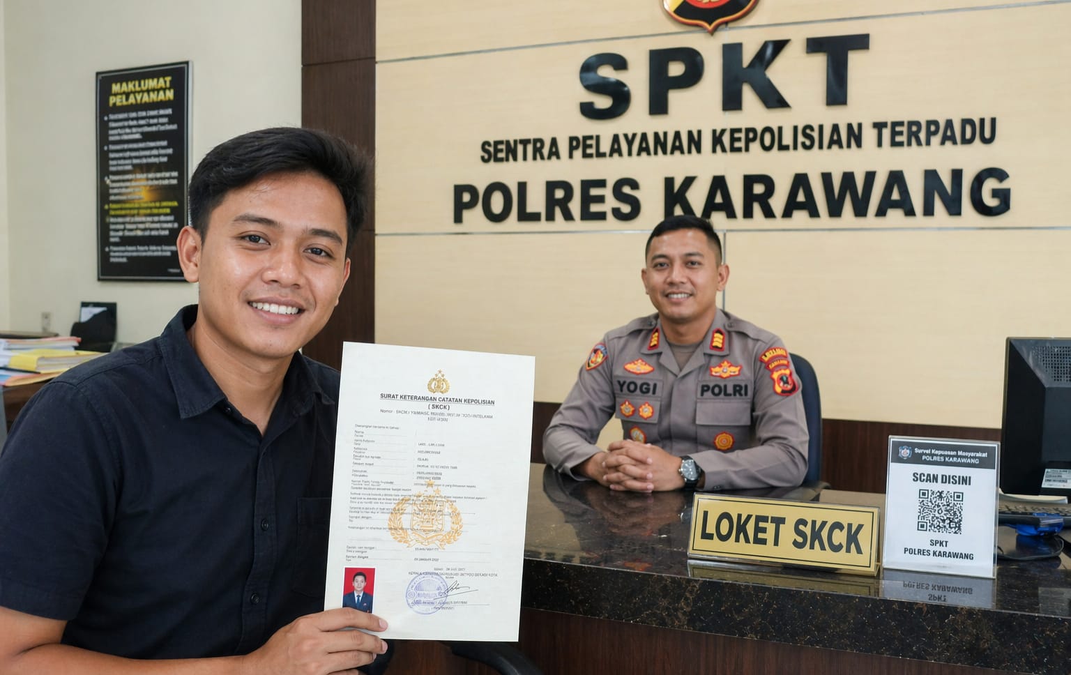 Ilustrasi: Pelayanan pembuatan Surat Keterangan Catatan Kepolisian (SKCK) di Polres Karawang. Pemohon menunjukkan dokumen SKCK yang telah diterbitkan di loket pelayanan, sebagai bagian dari proses administrasi kepolisian.